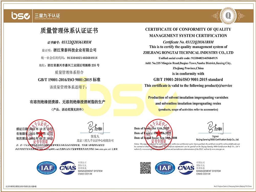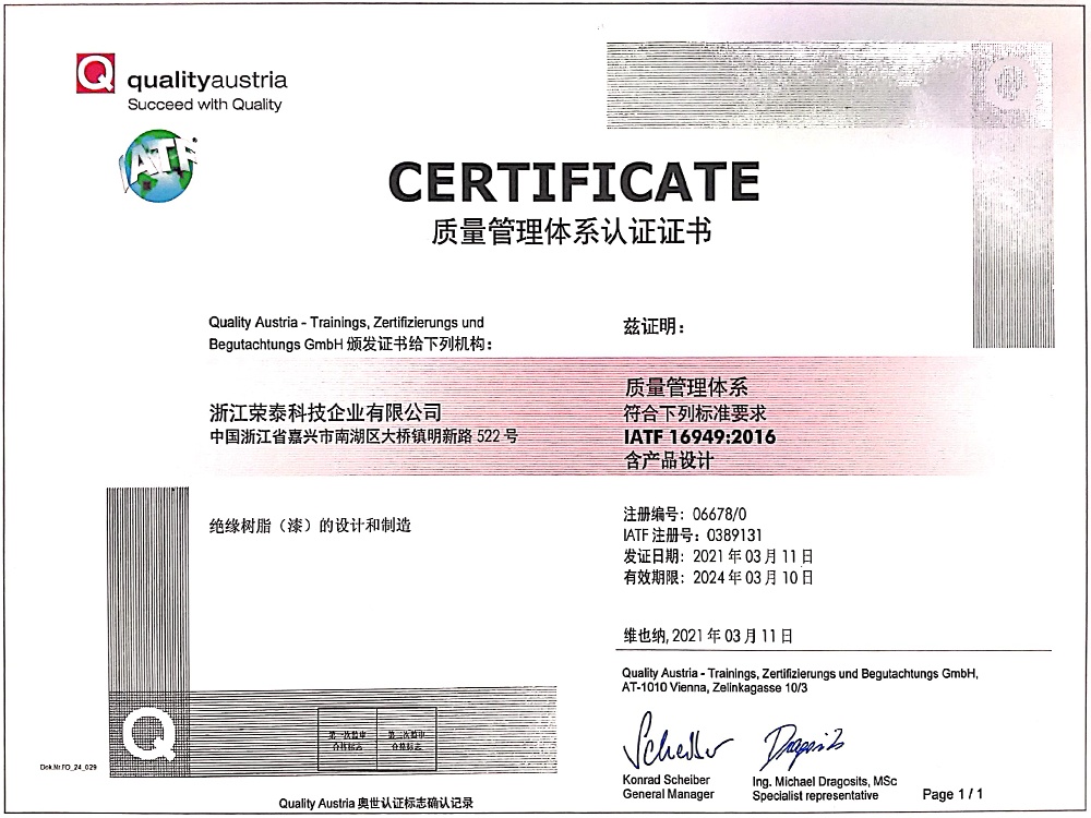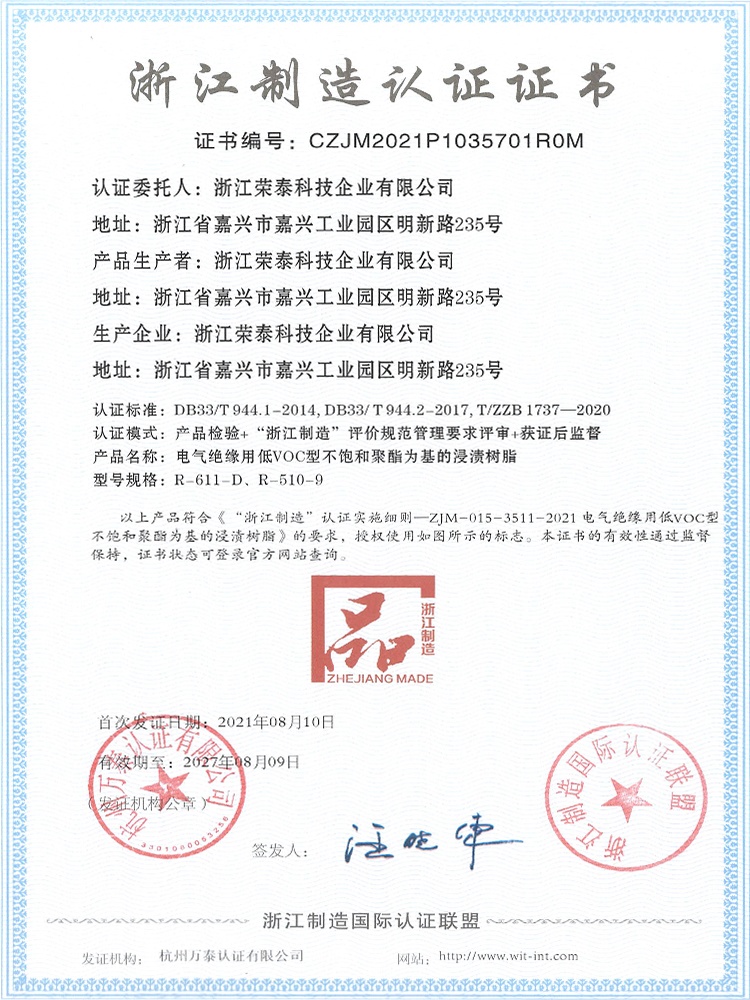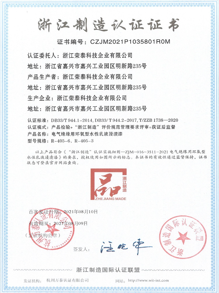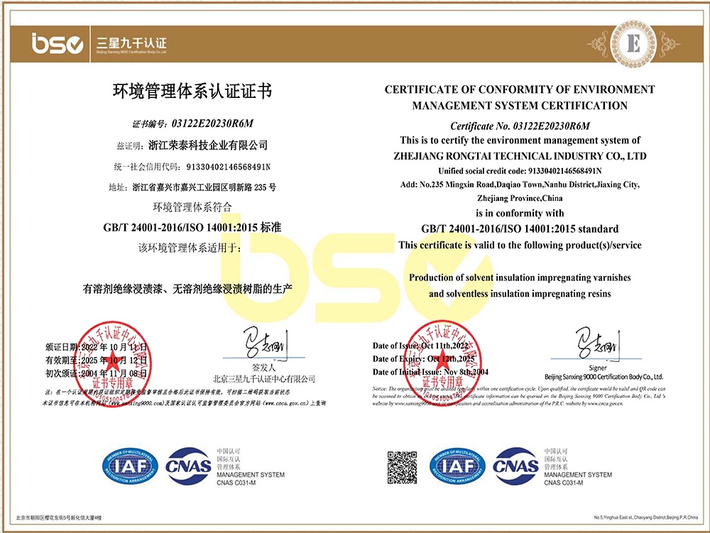 • 浙江榮泰科技企業有限公司為專業生產高性能絕緣材料的國家高新技術企業、國家“小巨人”企業,為國內最大的絕緣漆生產商,全國絕緣材料行業協會的副理事長單位,規模、產品技術和創新能力處于同行業領先地位。